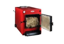 Ikonica kotla na čvrsto gorivo sa otvorom za loženje i drvima u unutrašnjosti.