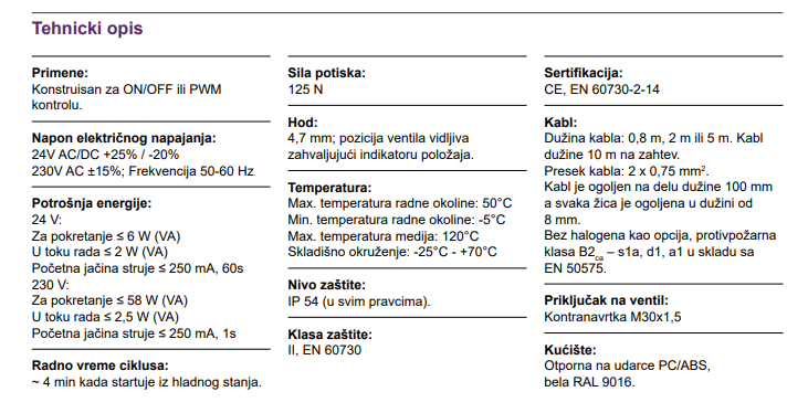 Radni napon: 230 V AC ili 24 V AC (zavisno od modela)