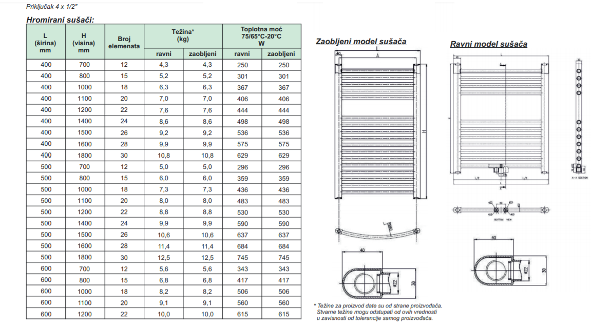 | Konstrukcija | Cevasti registar – ravni tip, hromirana završna obrada |