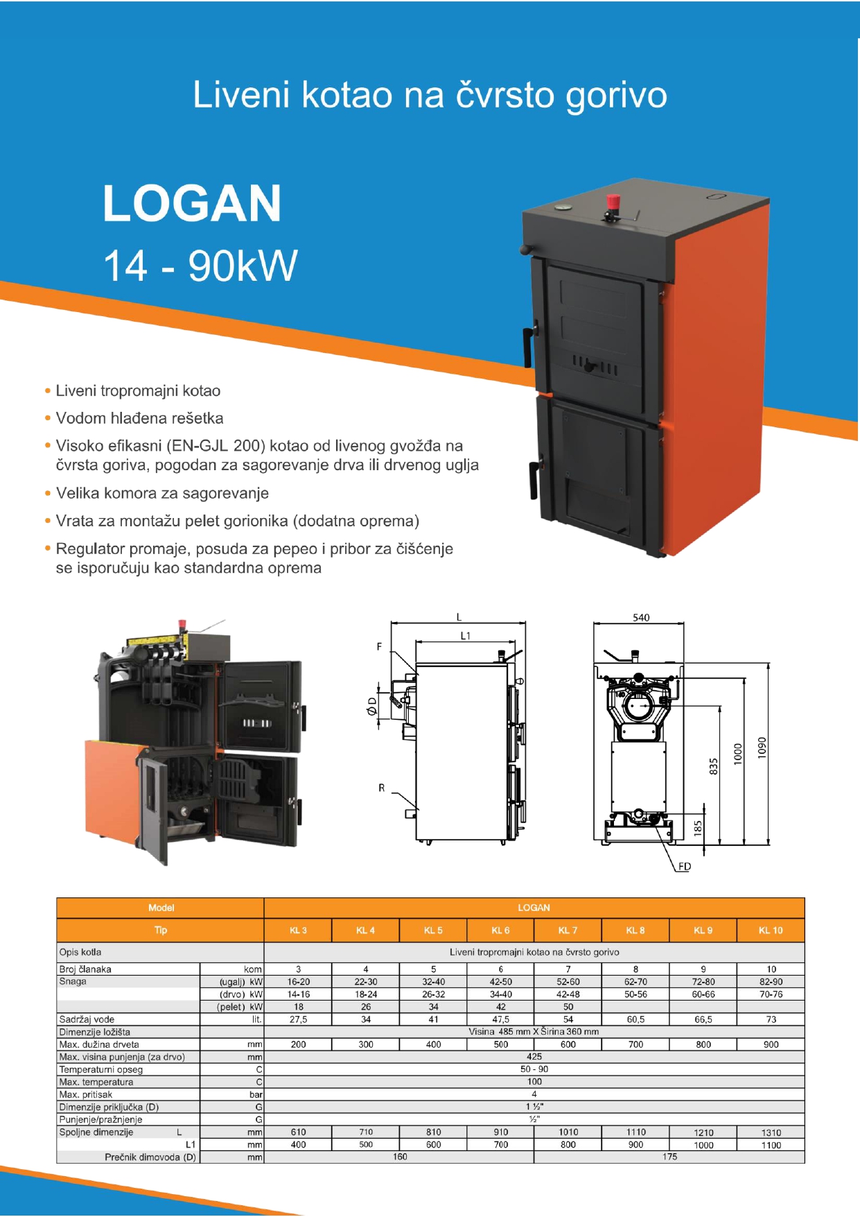 Kotao Logan 9 čl. 66–80 kW je liveni kotao na čvrsto gorivo, sa kompletnim priborom, namenjen pouzdanom grejanju vrlo velikih kuća, poslovnih objekata i hala do 450 m².