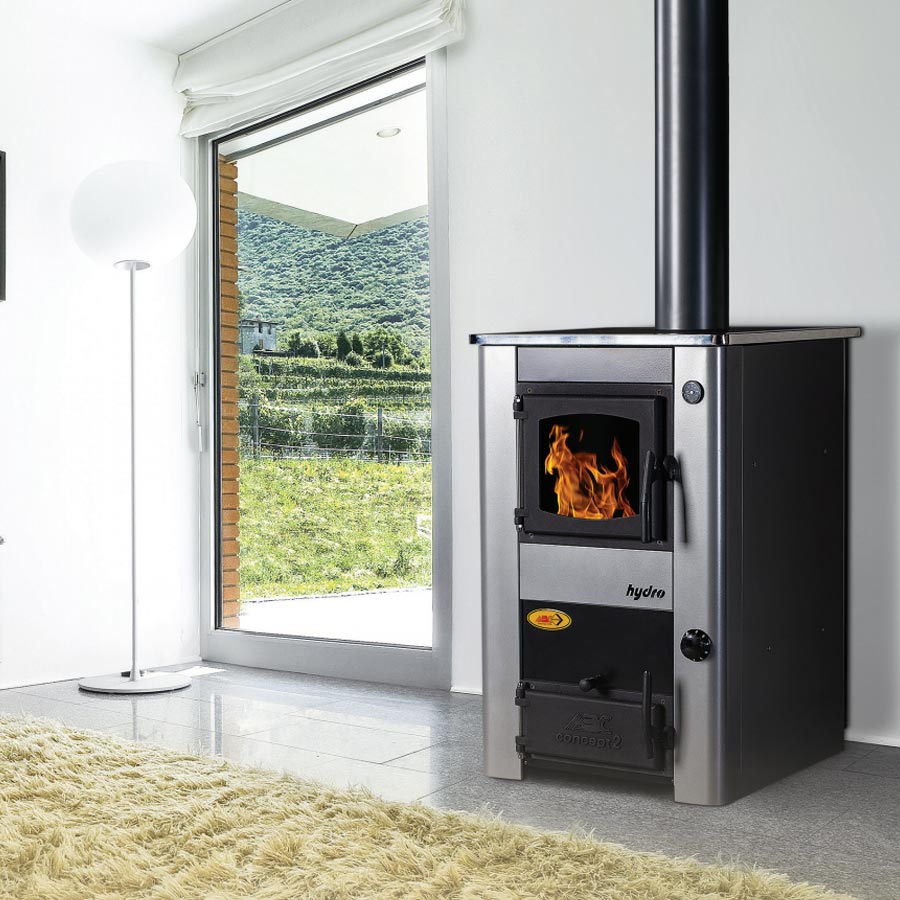 Odaje utisak kamina, zahvaljujući vatrostalnom staklu na vratima ložišta. Konstrukcija šporeta CONCEPT 2 MINI omogućava precizno regulisanje intenziteta temperature, lako loženje gorivom i čišćenje pepela. (23 kW snaga preneta na vodu, 2 kW snaga predata zračenjem)