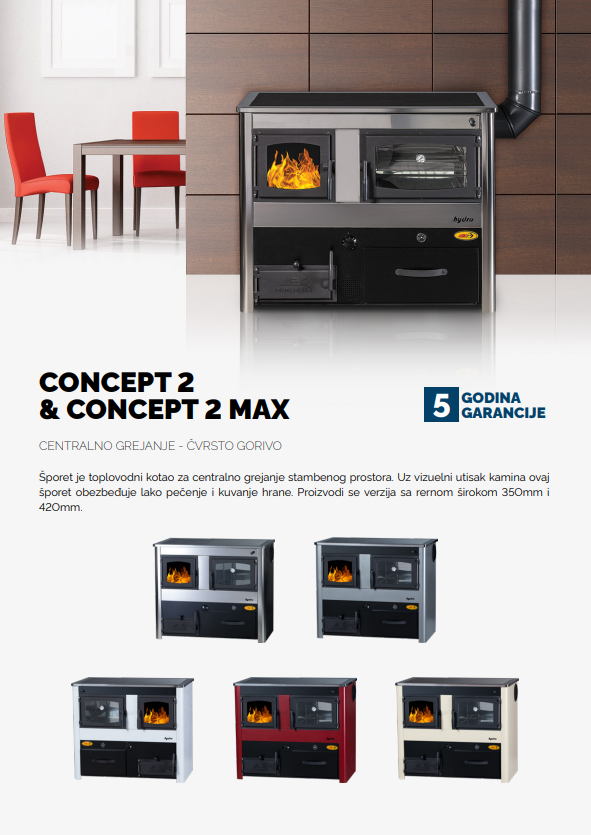 Toplovodni šporet‑kotao CONCEPT 2 / CONCEPT 2 MAX na čvrsto gorivo, kapaciteta grejanja za 150–200 m², sa mogućnošću pečenja i kuvanja. Dostupan sa rernama širine 350 mm ili 420 mm. Dolazi sa 5 godina garancije.