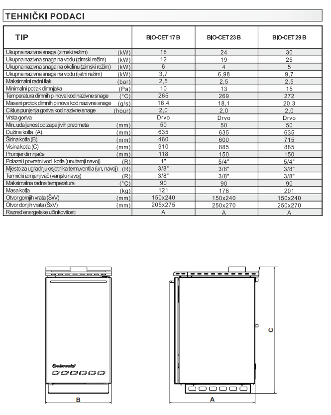 Centrometal BIO‑CET 29 je čelični toplovodni etažni kotao na čvrsto gorivo sa gornjim odvodom dima, namenjen za centralno grejanje objekta uz mogućnost kuvanja hrane. Ukupni toplotni učinak iznosi 30kW — od čega se 25 kW predaje grejnoj vodi, dok se preostali deo 5 kW prenosi u prostor preko gornje ploče.