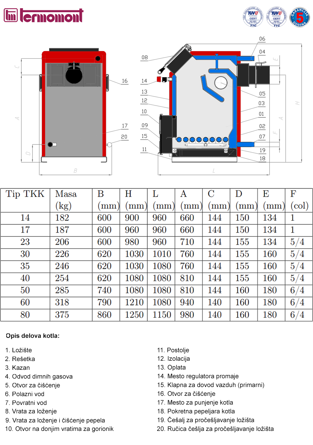 Model Termomont TKK 80 kW pruža stabilan rad, visok stepen iskorišćenja goriva i pouzdanost u radu čak i pri dugotrajnom opterećenju. Kao proizvod domaće izrade, odlikuje se kvalitetnim materijalima, jednostavnim servisiranjem i dostupnošću rezervnih delova. Idealan je izbor za korisnike koji žele kotao velikog kapaciteta sa niskim troškovima eksploatacije i dugim radnim vekom.