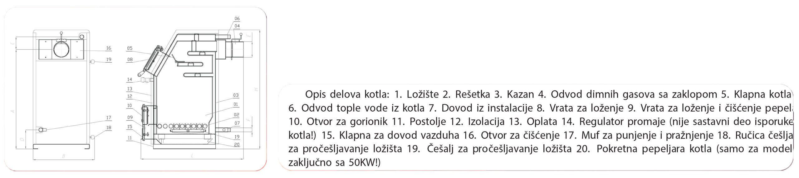 Ložište sa rostom od vodohlađenih cevi omogućava optimalno sagorevanje i smanjenu potrošnju goriva. Kvalitetni čelični limovi garantuju dug vek trajanja kotla i otpornost na visoke temperature, dok kosi dizajn ložišta i tri horizontalne promaje poboljšavaju efikasnost i raspodelu toplote.