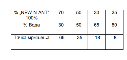 | Tačka mržnjenja (°C) | % NEW N-ANT | % Voda |