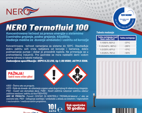Termofluid NERO (žuti) je tehnička tečnost na bazi etilen glikola, formulisana u mešavini 66% koncentrata i 34% demineralisane vode, sa tačkom smrzavanja do -17°C. Namenjen za zaštitu zatvorenih sistema grejanja, rashlade i toplotne distribucije od smrzavanja, korozije, stvaranja kamenca i pene.